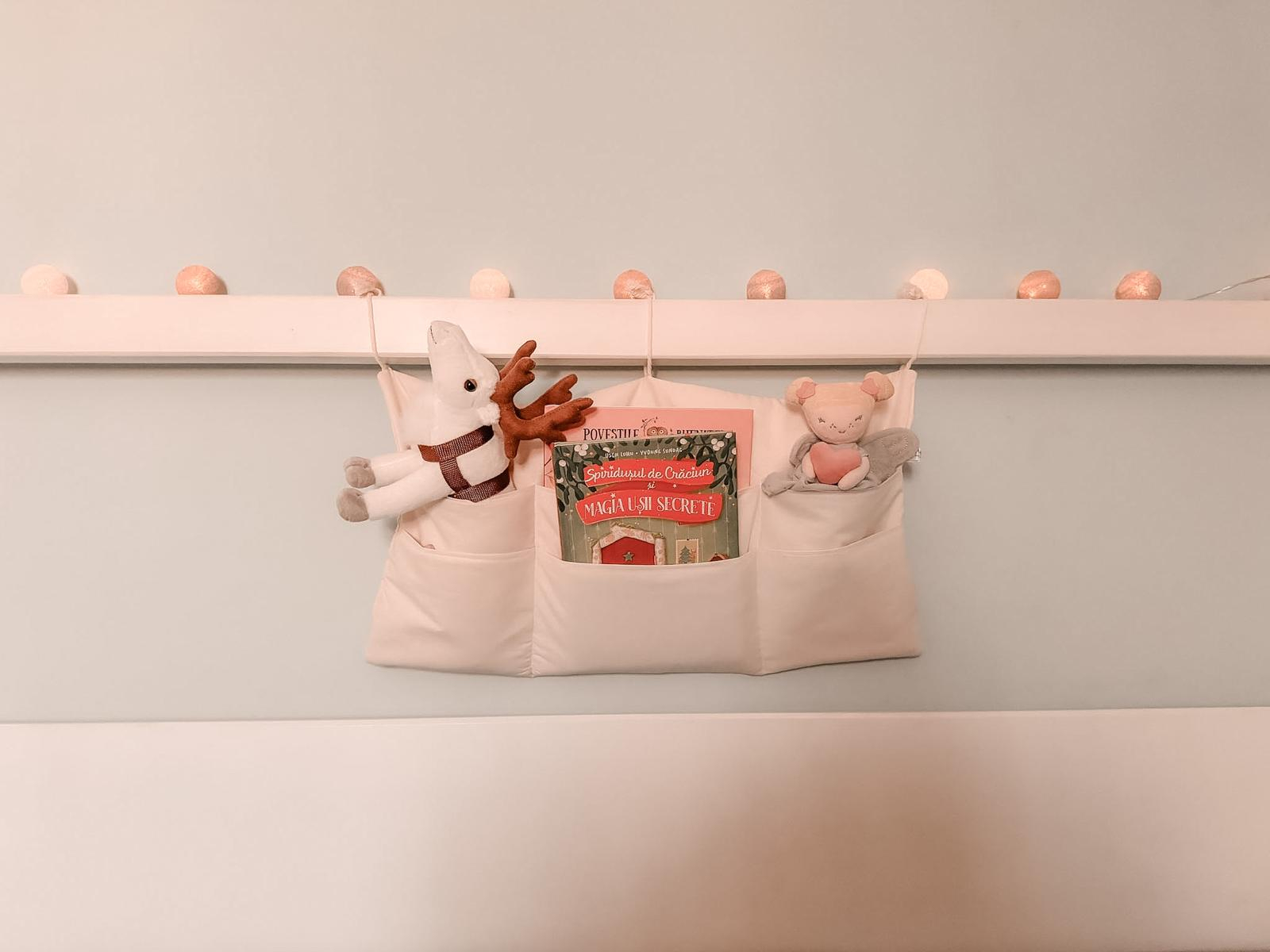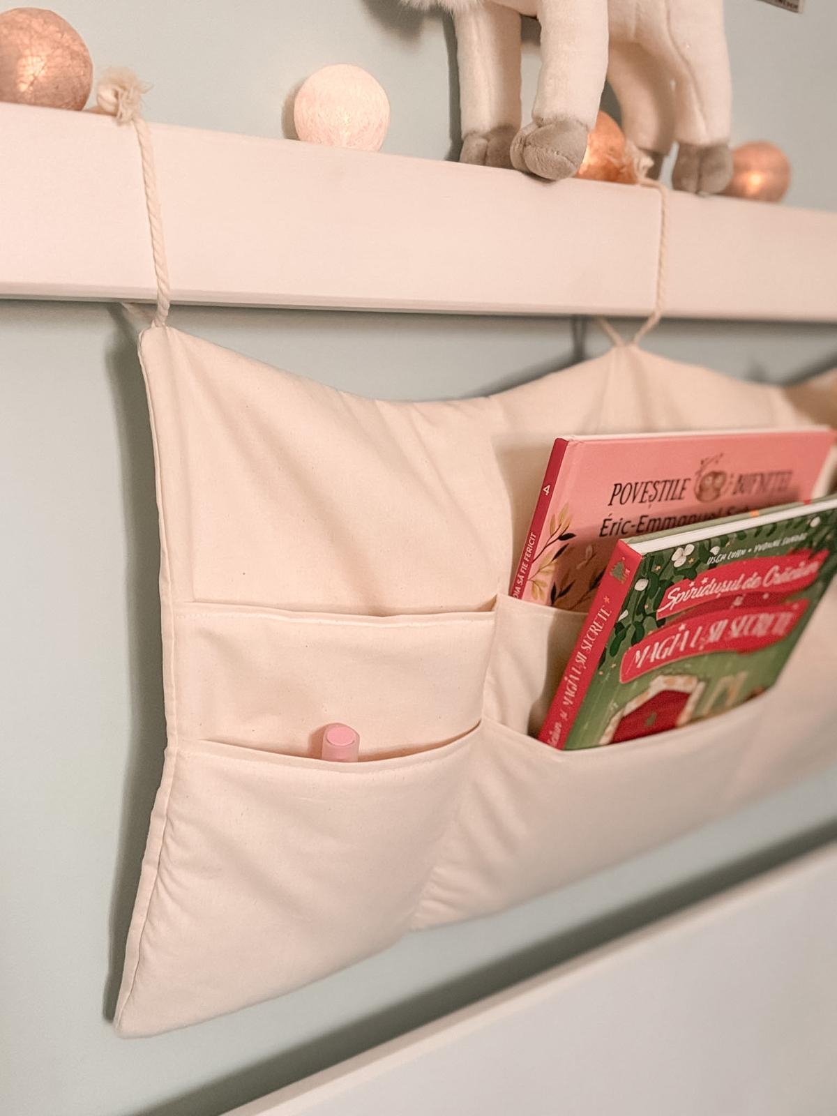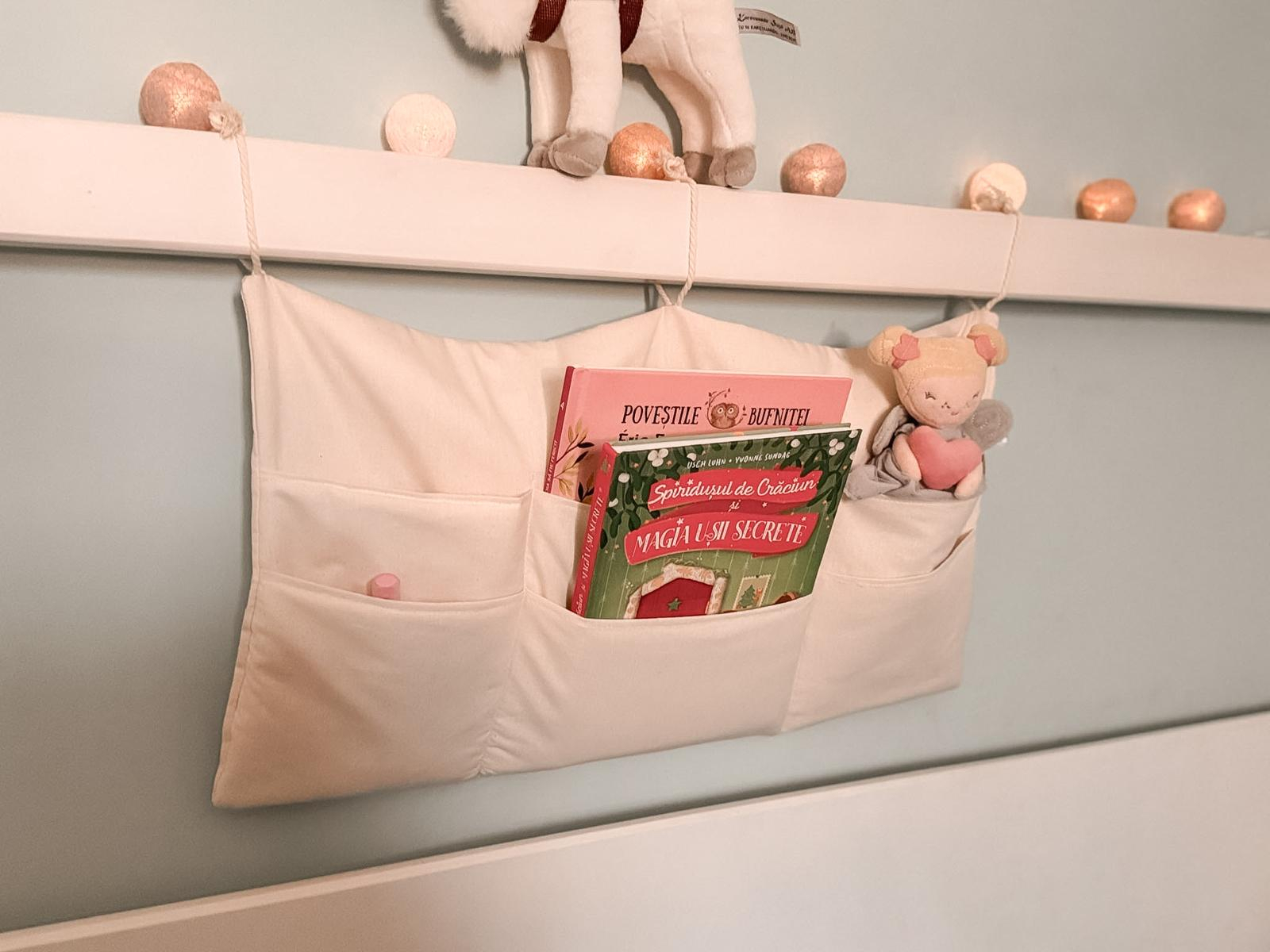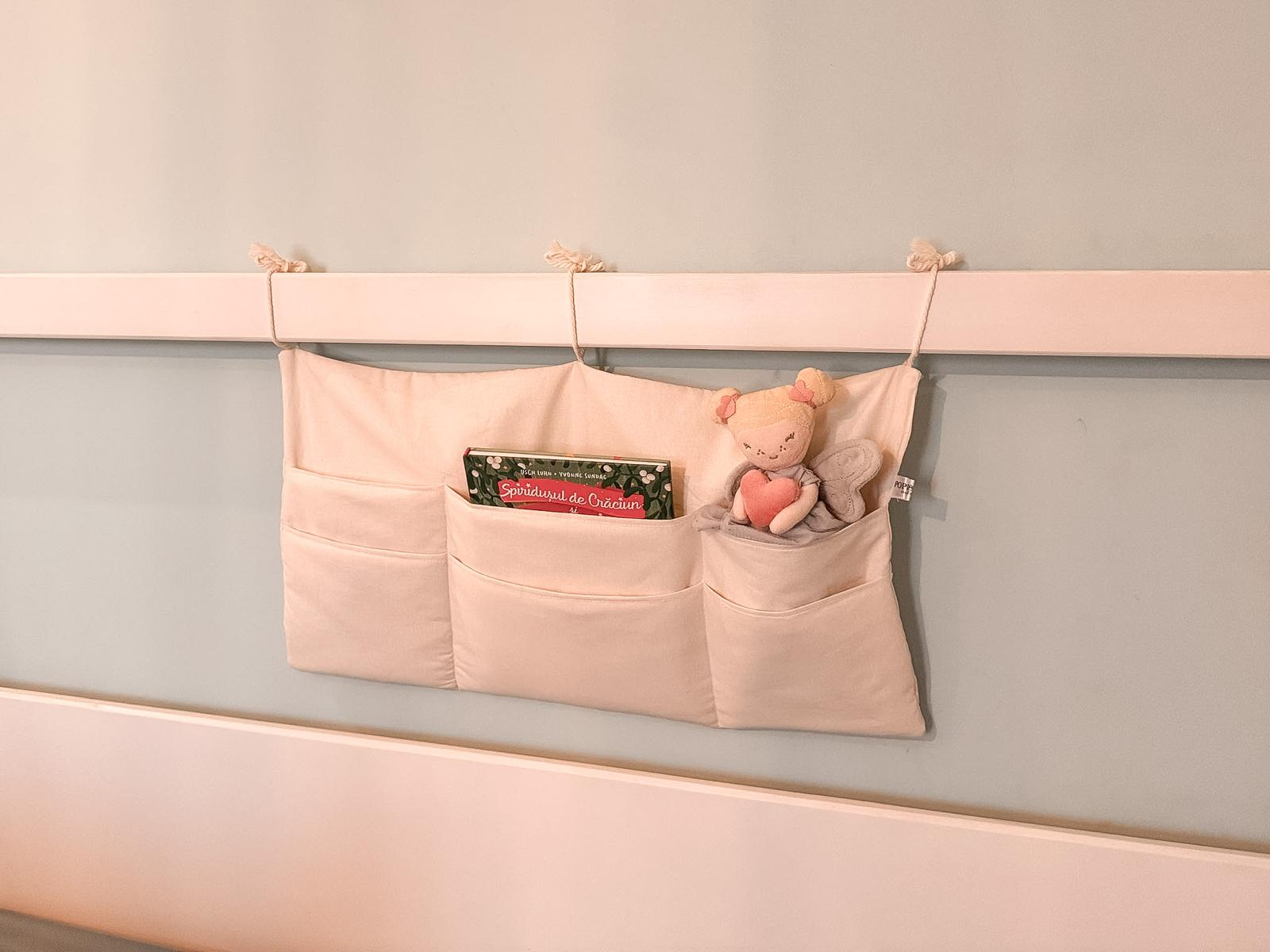Acest buzunar de pat are trei compartimente gândite pentru organizare eficientă: unul mai mare pentru cărți sau jucării preferate și două mai mici pentru obiectele mărunte.