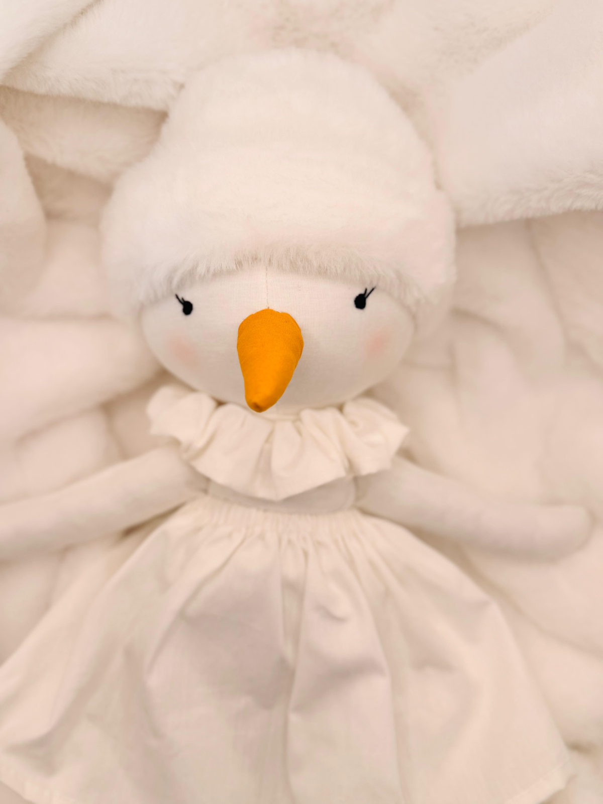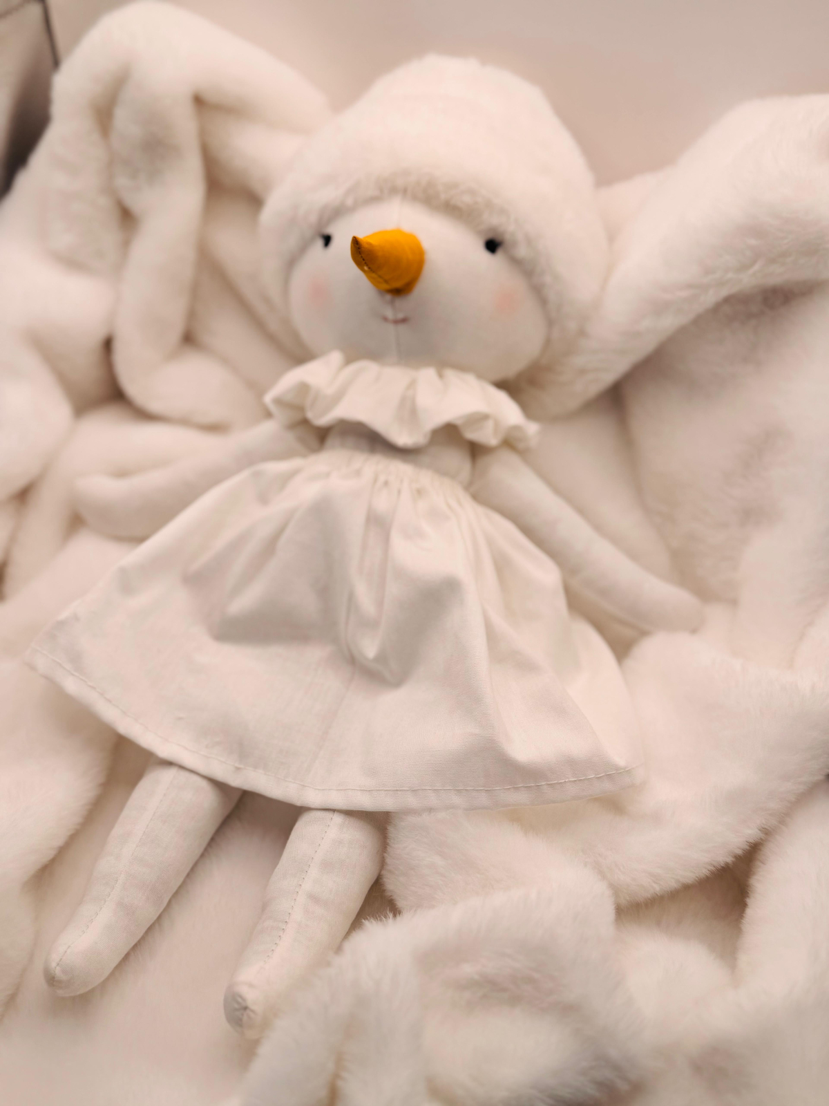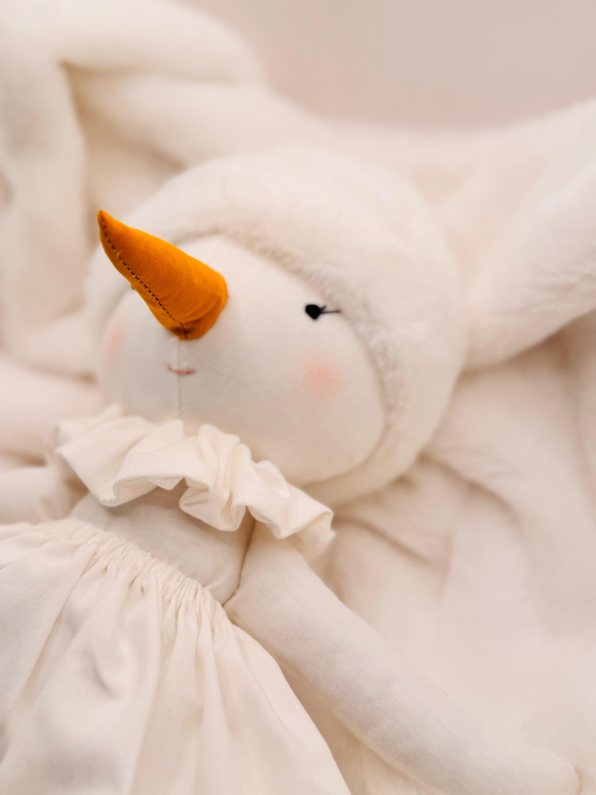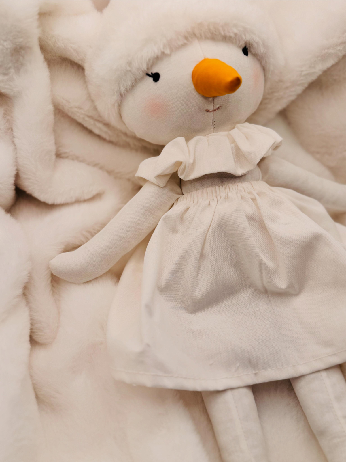 Această păpușa inspirată din poveștile bunicilor cu zăpadă care depășea înălțimea gardului, este o jucărie handmade delicată realizată din bumbac moale, cu accesorii delicate și expresie dulce. Aceasta poartă o căciulă pufoasă, guler și fustă asortată. Detaliile fine, precum zâmbetul gingaș și nasul în formă de morcov, îi oferă un aer cald și jucăuș.