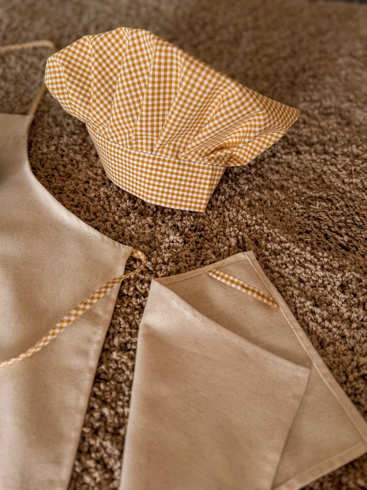 Setul vine in două variante de print si este compus dintr-un sorț, bonetă de bucătar, un șervet și manușă de bucătărie.